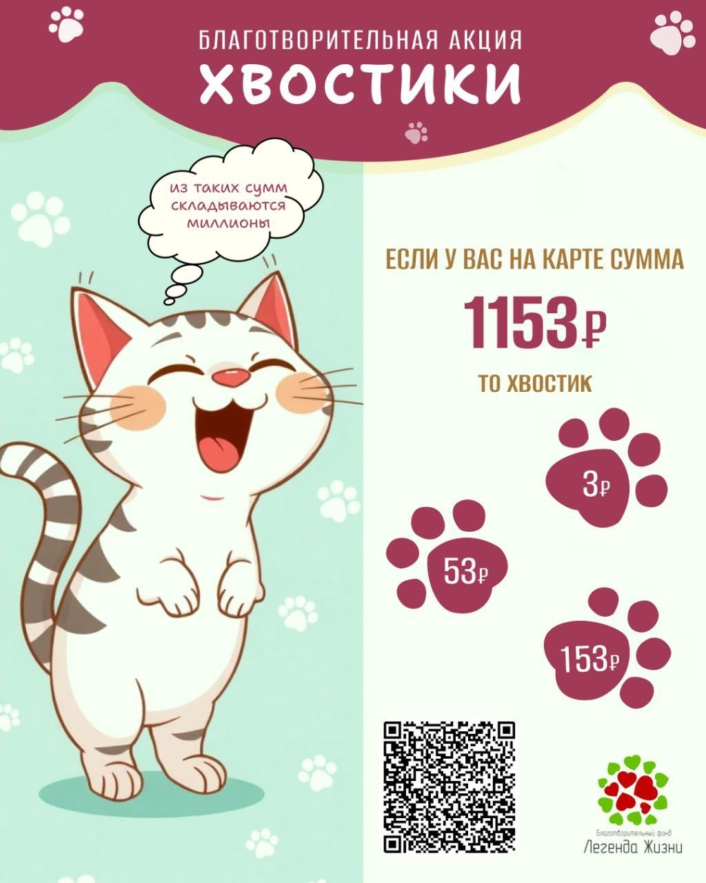 Это значит, что любая сумма, которая есть у вас на карте, может СПАСТИ ЖИЗНЬ! Если эта сумма, например, 1153 рубля, то её хвостик - 3, 53,153 рубля и т.д. Из таких сумм складываются миллионы!