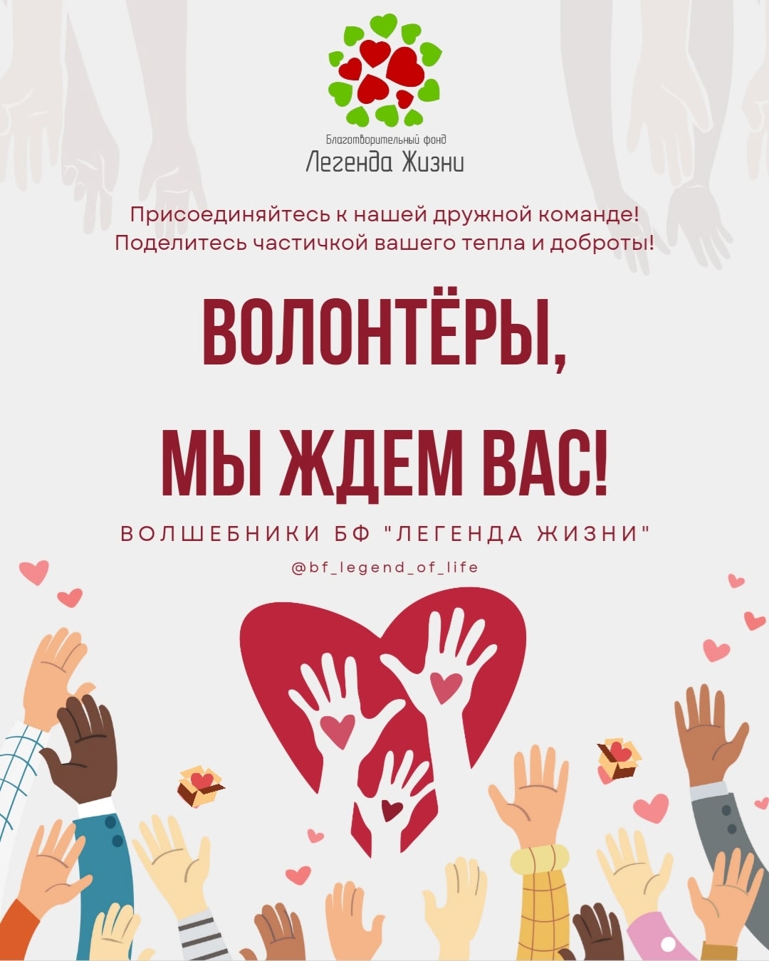 Наша большая и дружная команда ждёт именно Вас! Просим всех с горящими сердцами и доброй душой присоединиться и стать волонтером Благотворительного фонда "Легенда Жизни"! Обо всем расскажем и всему научим! Вместе мы сможем больше!